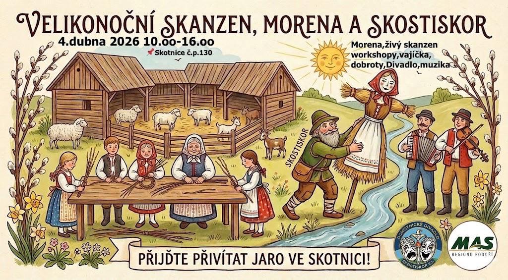 Skostiskor z.s. Ochotnické divadlo ze Skotnice zve všechny na Velikonoční skanzen s divadlem, tradicí a Moranou!v sobotu 4. dubna od 10 do 16 hodin, na odpočinkové místo u mostu ve Skotnici(č.p.130)  prožijte celý den plný jara. Občerstvení zajištěno.