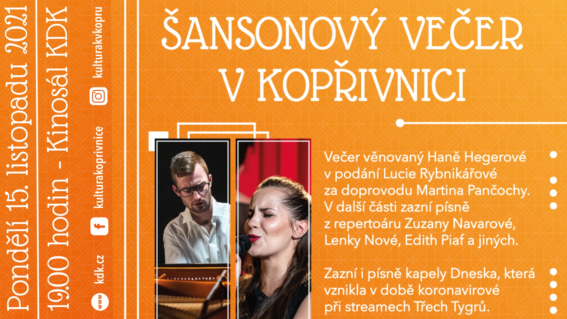 SOUTĚŽ O 3 VSTUPENKY NA šansonový večer, pondělí 15. 11. 2021, kino Kopřivnice, 19:00 hodin