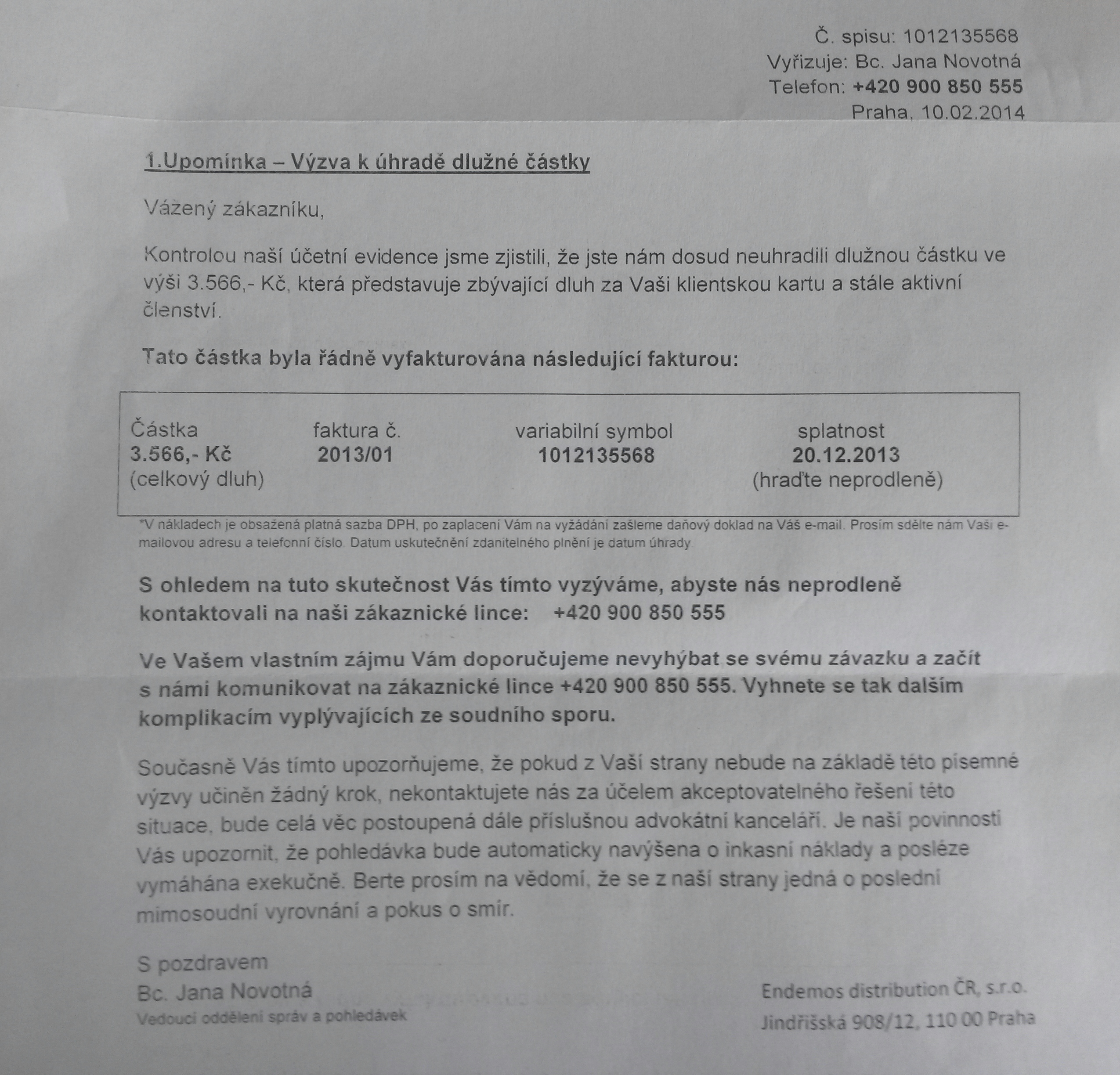 Přišel-li Vám odpis k úhradě dlužné částky 3 566 Kč společnosti Endemos Distribution Praha – kontaktujte policii!